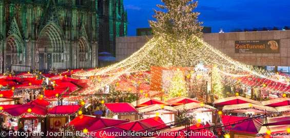 Probably the most attractive Christmas market in town is on the Alter Markt in front of Cologne’s town hall. Legend has it that the Heinzelmännchen (house gnomes) performed all sorts of different jobs for the locals: they prepared the sausages for the butcher, sewed the clothes for the tailor, and baked the bread for the baker. The winding alleys in the market are differently themed, just like the guilds of the past. For example there is the “Futtergasse” (Feeding Alley) where visitors can buy national and international food specialities, and the “Glitzergasse” (Glitter Alley) where fashion accessories are on sale. For the kids there is a nostalgic children’s roundabout, puppet theatre, an area for Santa Claus and many toy stands.